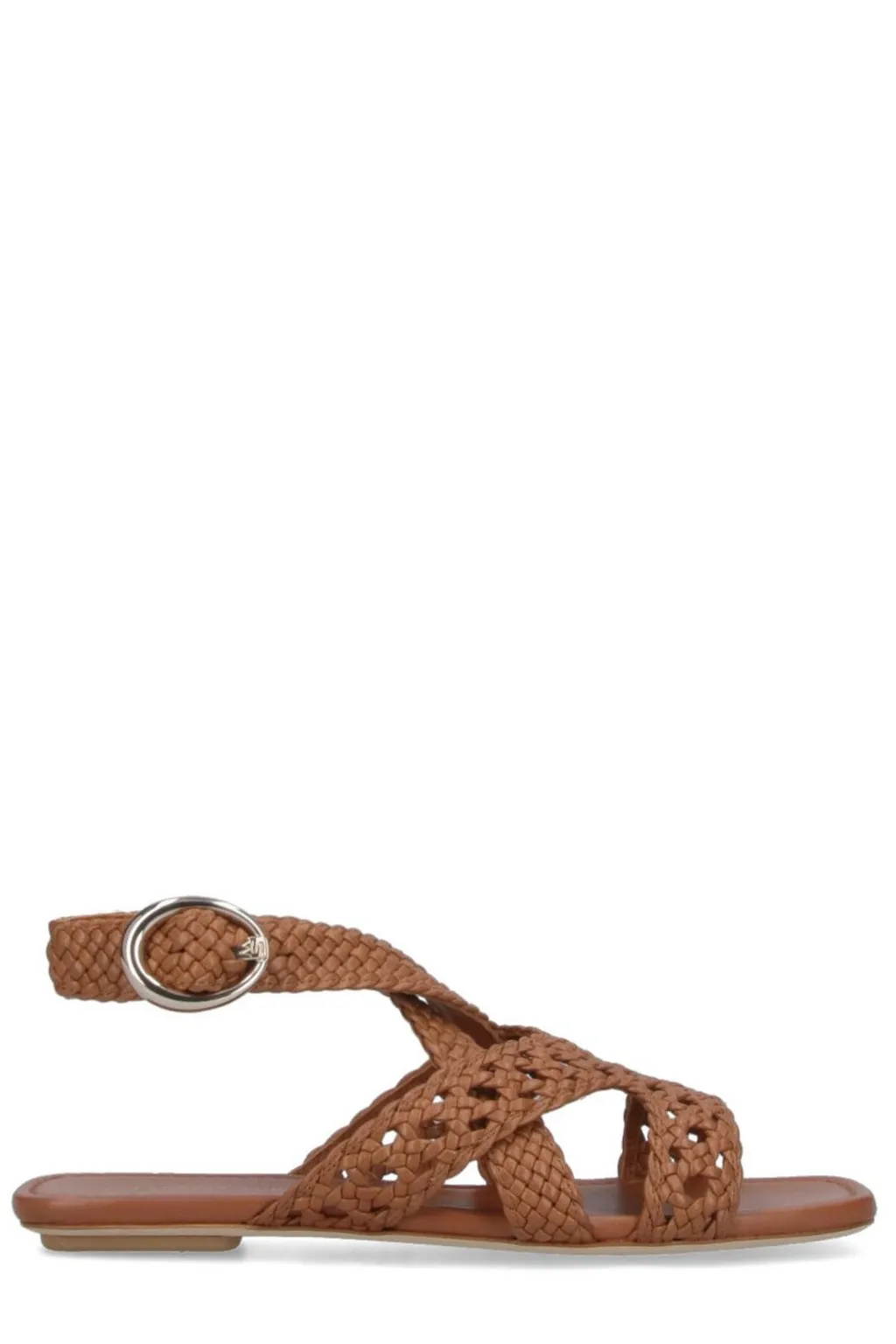 Flat sandals with a braided strap design across the vamp and an adjustable ankle strap with a buckle closure. The sole is flat and brown.