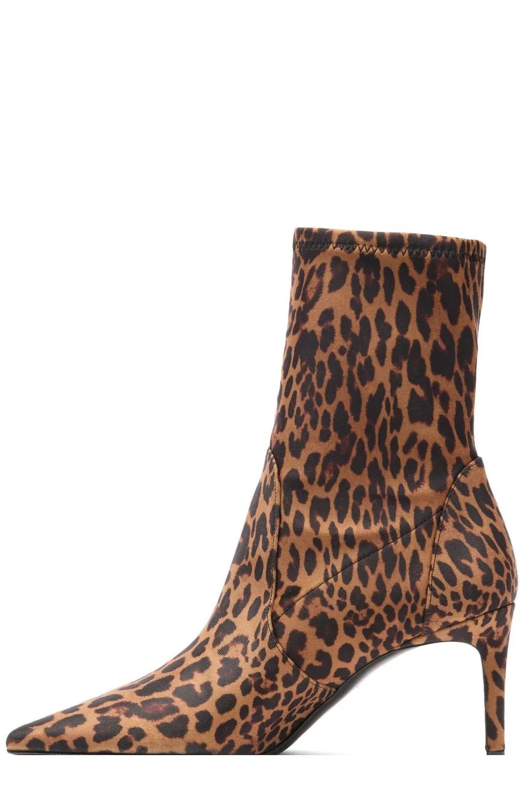 A leopard print sock bootie with a pointed toe and a stiletto heel. The bootie has a sleek silhouette and a pull-on design.