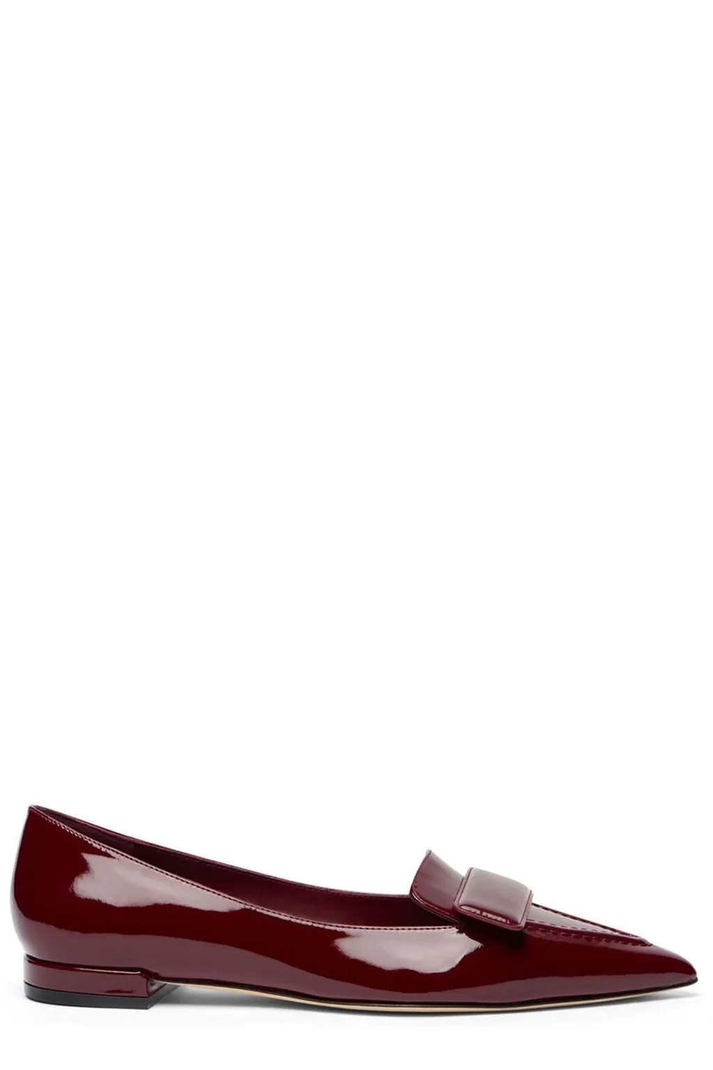 Women's burgundy patent leather pointed toe loafers with a low heel and a decorative strap across the vamp.