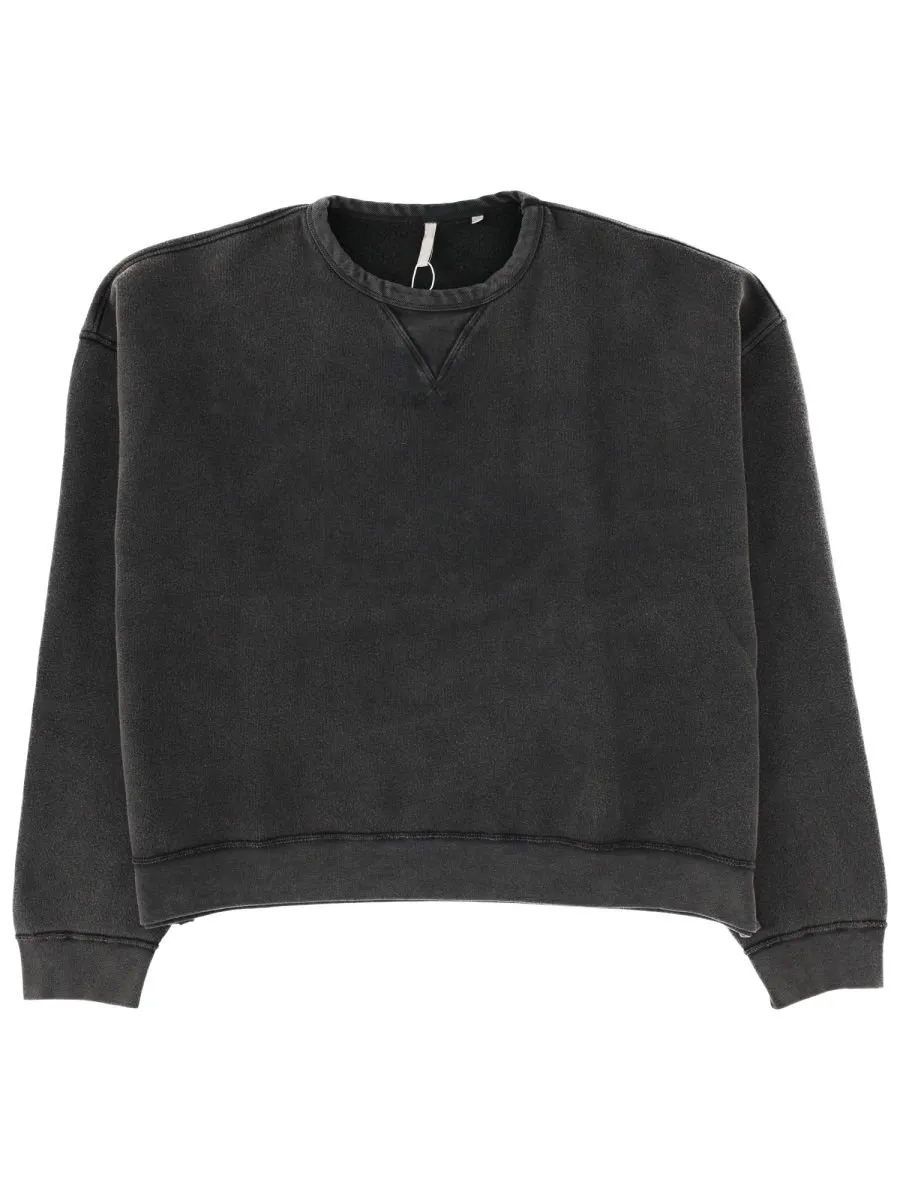 A classic crewneck sweatshirt with a relaxed fit. Features a ribbed crew neckline, cuffs, and hem. The fabric has a washed, slightly faded appearance.