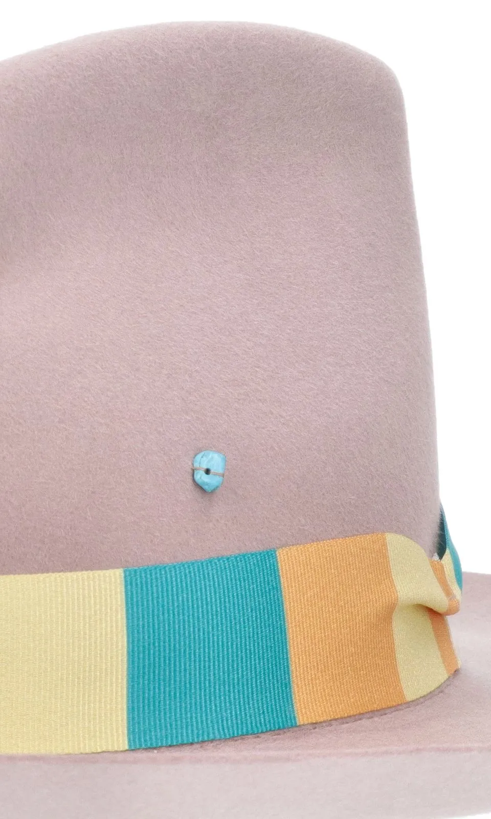 A pink fedora hat with a multicolored band around the crown. The band features stripes of yellow, green, red, and blue.