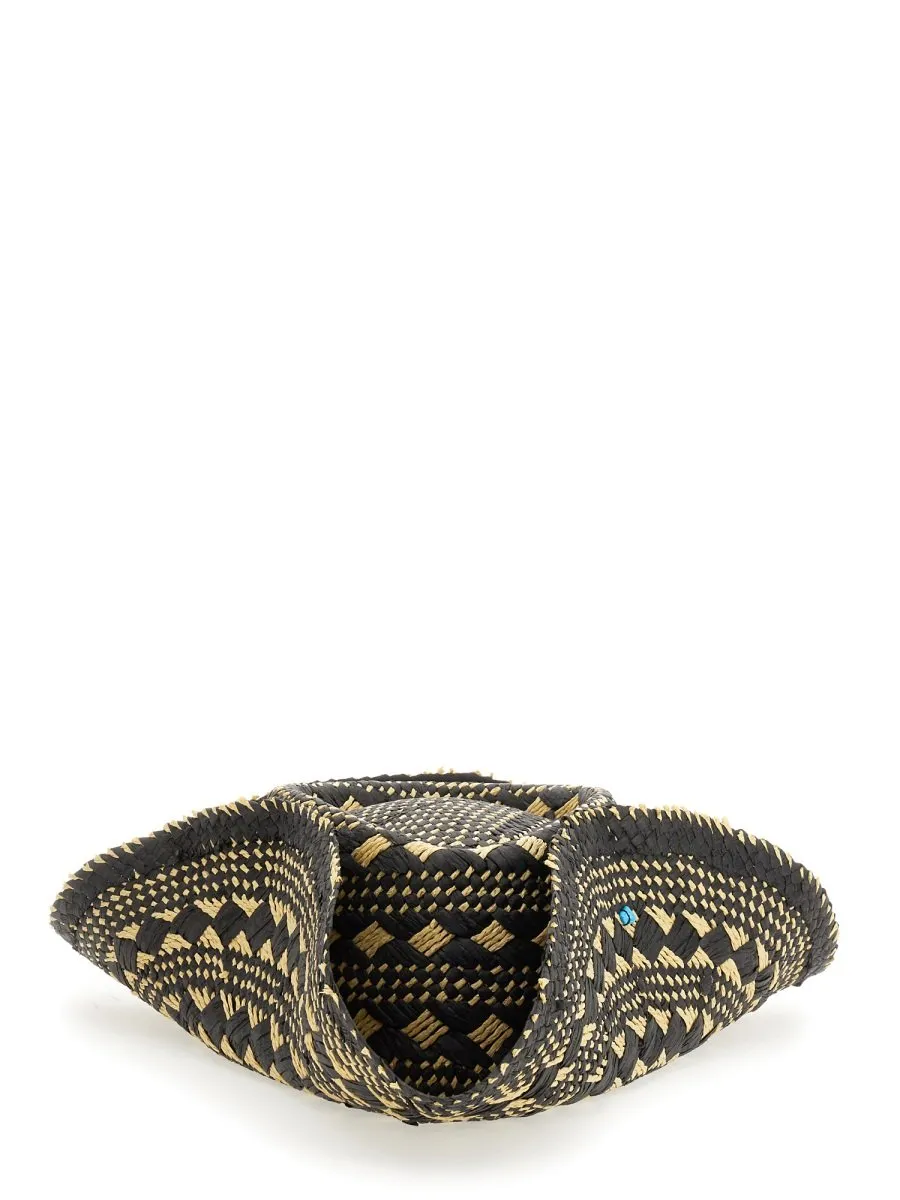 A woven hat with a wide brim and a patterned design. The hat features a black and beige woven pattern with small blue accents. The brim is flexible and curves downwards.
