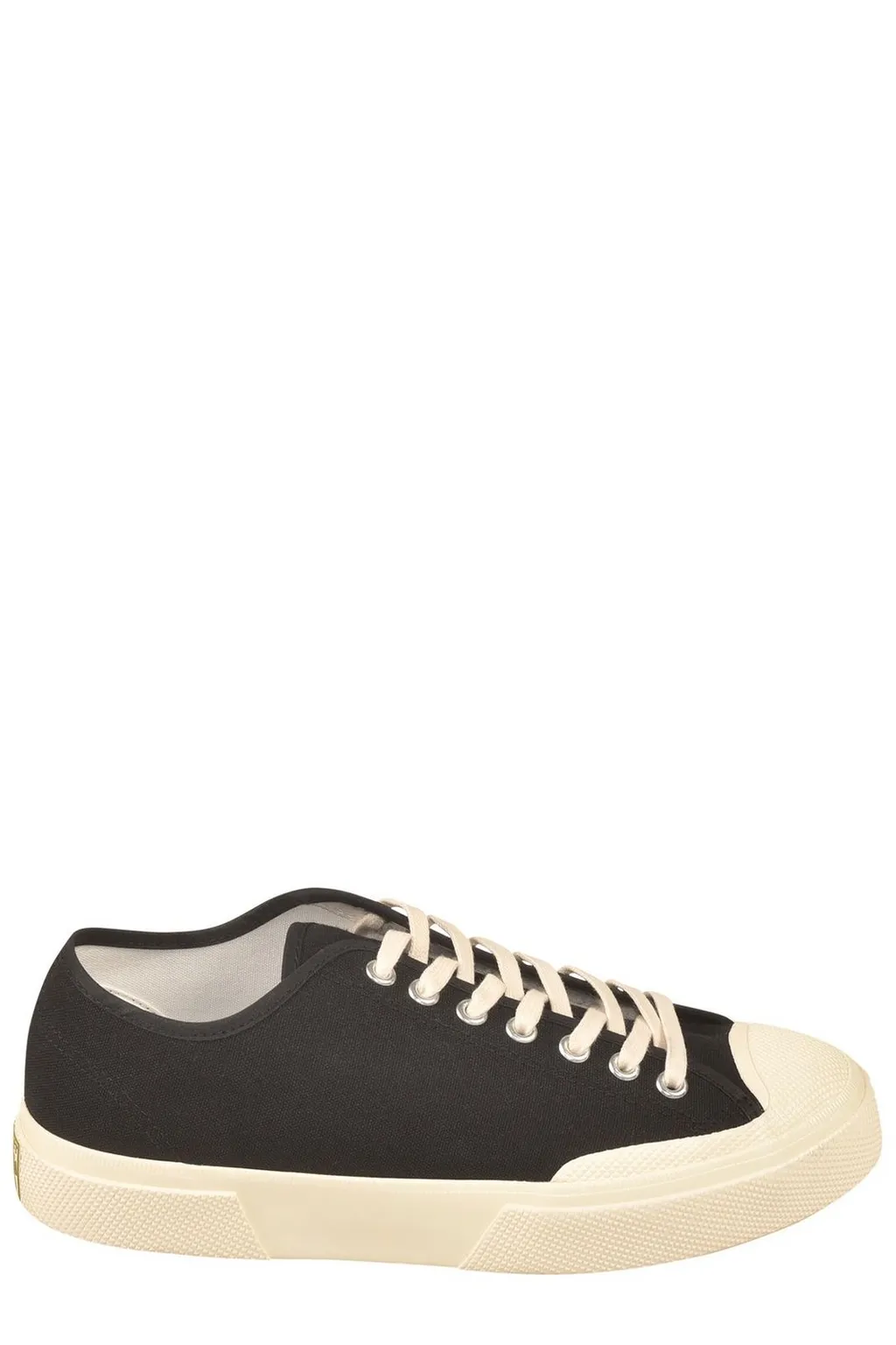 Classic low-top sneakers with a canvas upper, round toe, and lace-up closure. Features a contrasting rubber cap toe and a vulcanized rubber sole.