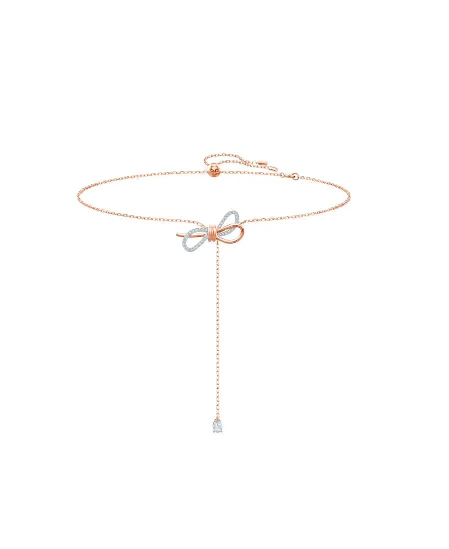 Rose gold tone plated necklace with crystal embellishments. Features a bow tie pendant with a dangling pear-cut crystal. Adjustable sliding closure.