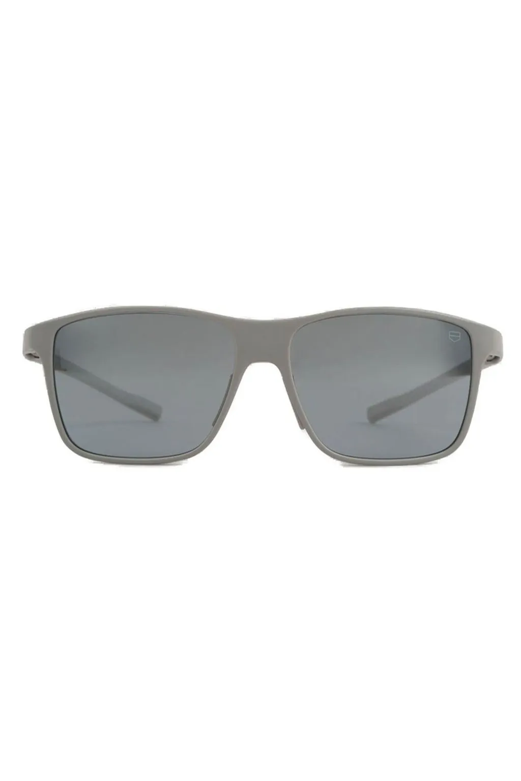 Grey rectangular sunglasses with tinted lenses and a subtle logo on the temple.