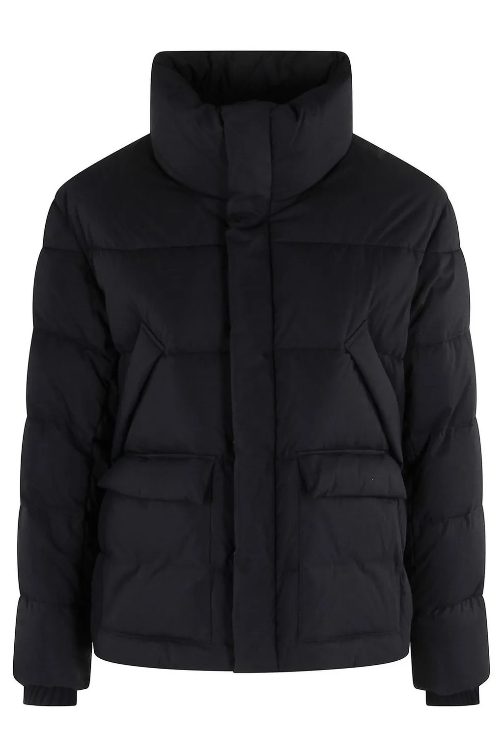 A black puffer jacket with a high collar and two front pockets. The jacket features a quilted design and a front zipper closure.