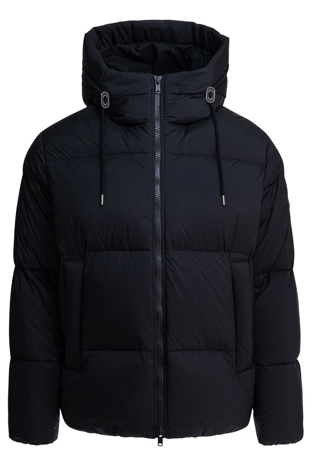 A black puffer jacket with a high collar and a full zip closure. It features a quilted design and a hood with adjustable drawstrings.