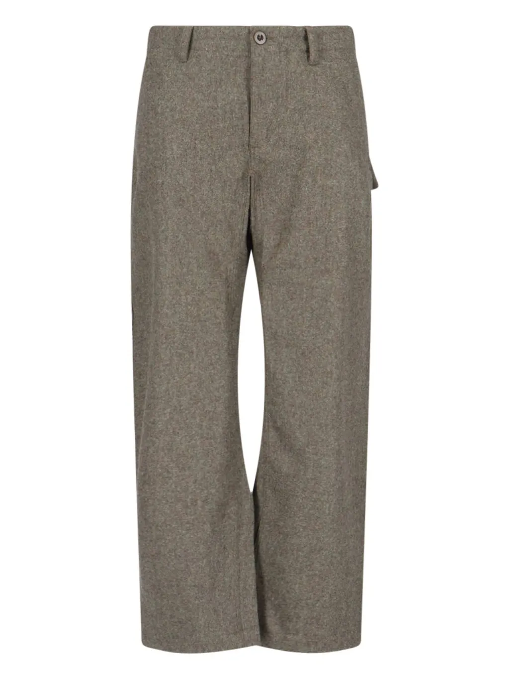 These are brown cargo pants with a loose fit. They feature a zip and button closure, belt loops, and two front pockets. The back has two large flap pockets and a small patch with a logo. The fabric appears to be a textured wool blend.