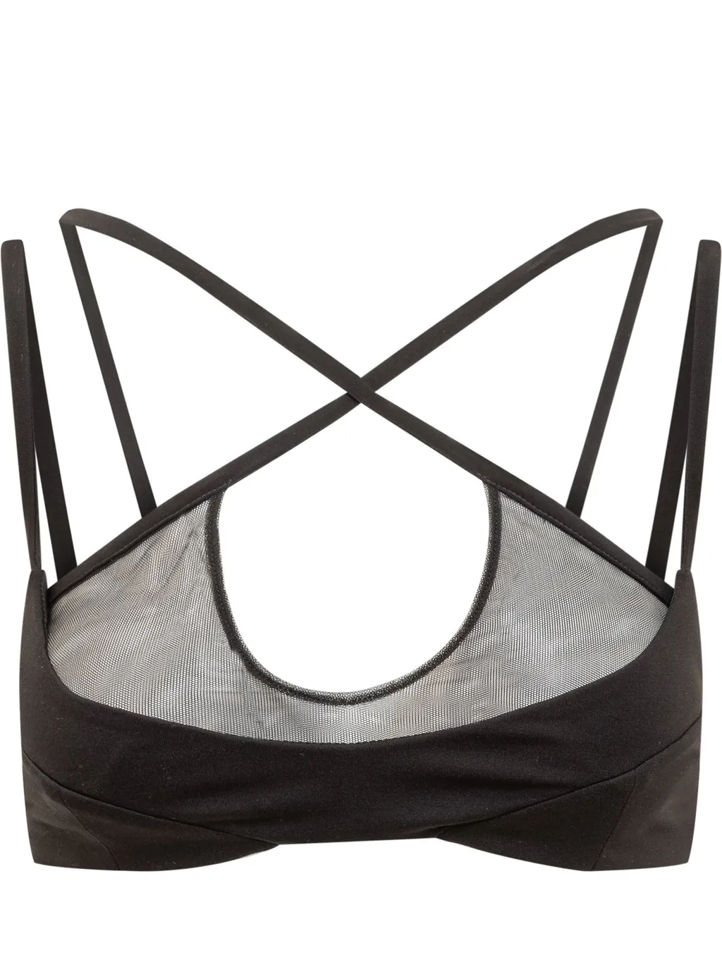 A black bra top with a mesh insert at the bust. Features thin, adjustable straps that cross at the back and a hook-and-eye closure at the center back.