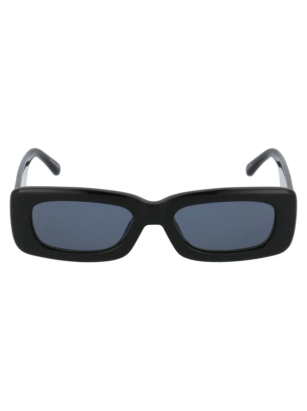 Black rectangular sunglasses with thick frames and dark lenses. Features a subtle gold logo on the temple.