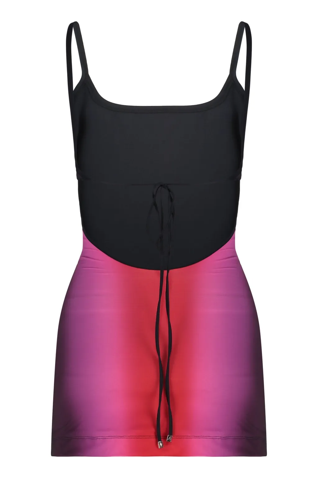 A mini slip dress with a square neckline and thin spaghetti straps. The dress features a gradient color effect, transitioning from pink to red. The back has a black panel with a lace-up detail.