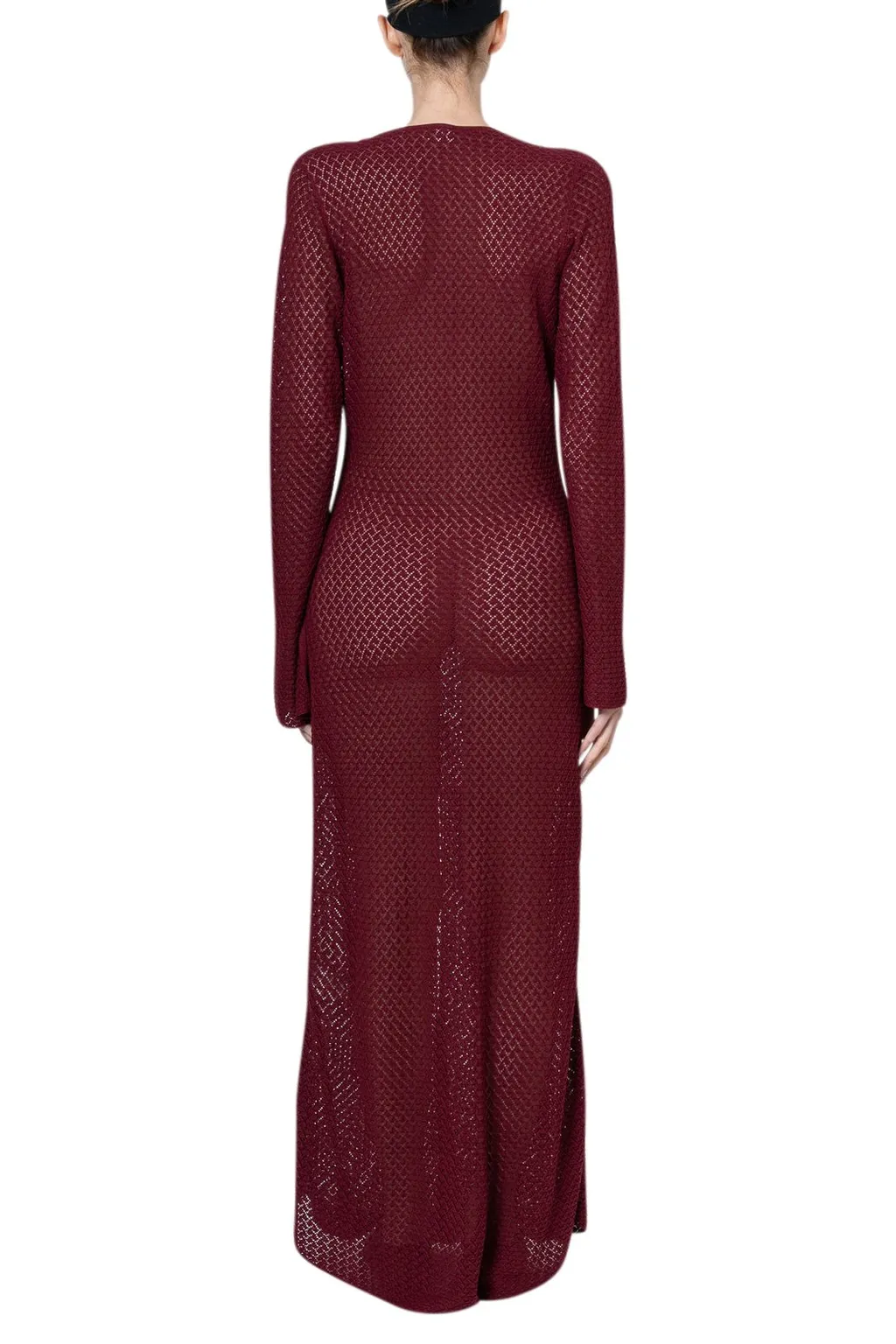 A long, open-front cardigan with a deep v-neckline and long, flared sleeves. The cardigan features a textured, open-knit pattern throughout and a subtle slit at the hem. It is fastened at the bust with a small black bow detail.