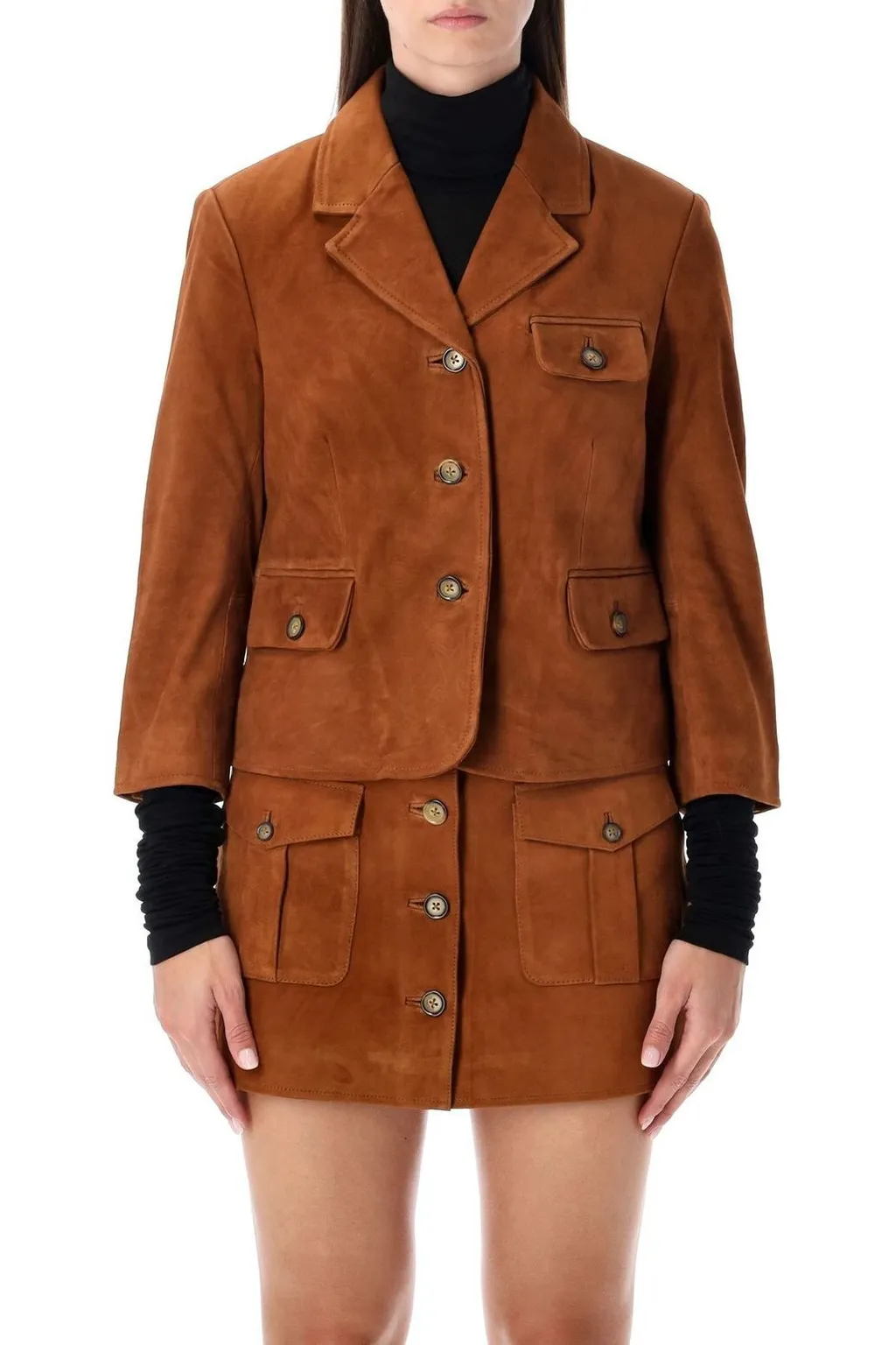 DescriptionA two-piece set featuring a cropped blazer with a notched lapel, two front flap pockets, and a single-breasted button closure. The matching mini skirt has a high waist, two front flap pockets, and a button-front closure. Both pieces are made of suede.