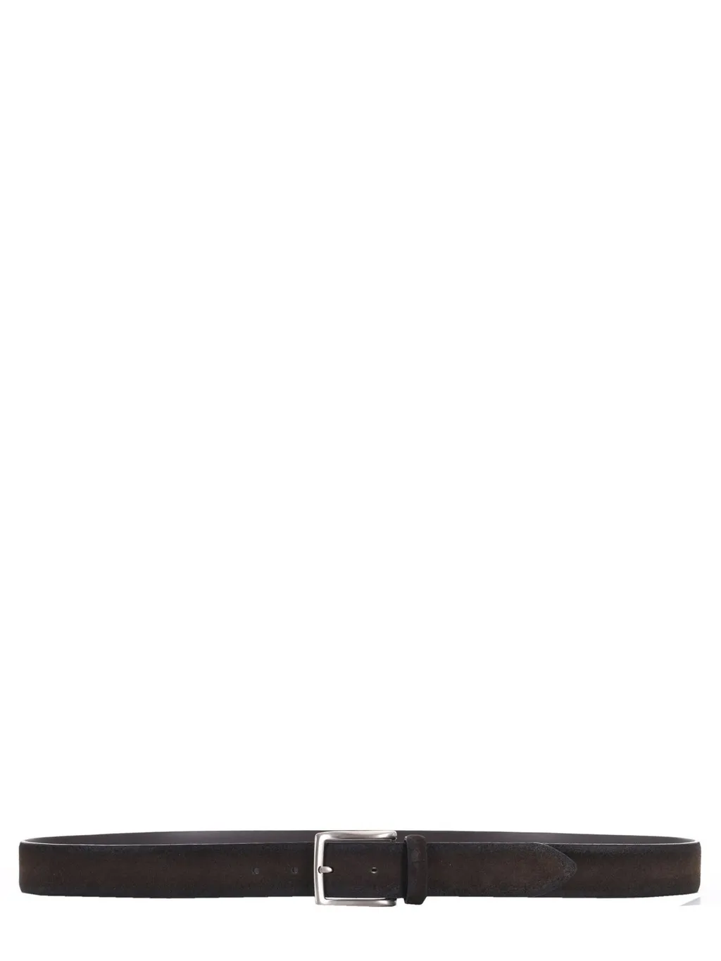 A dark brown leather belt with a silver buckle. The belt is simple and classic in design.
