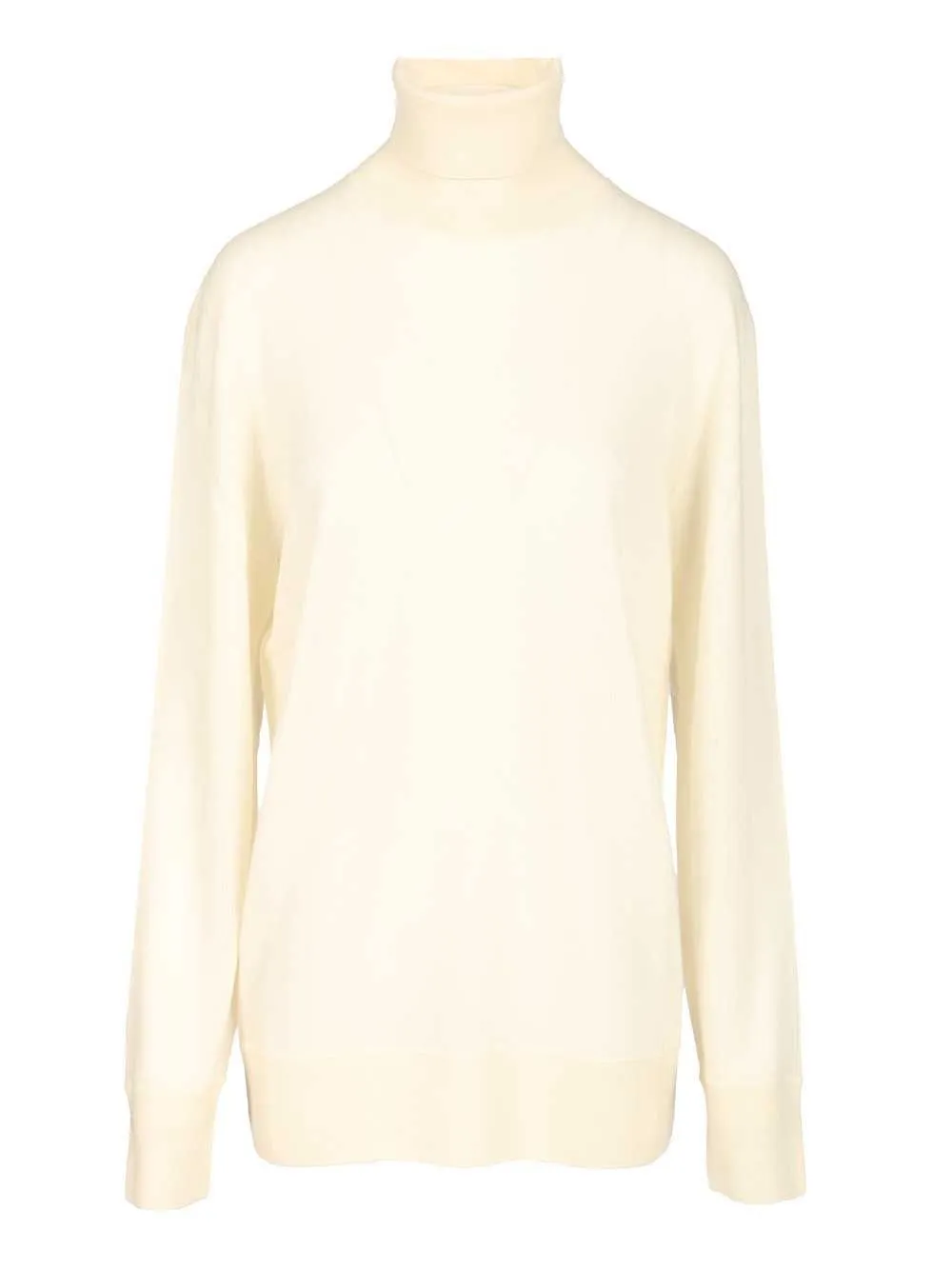 A cream-colored, long-sleeved, turtleneck sweater. It has a relaxed fit and ribbed cuffs and hem.