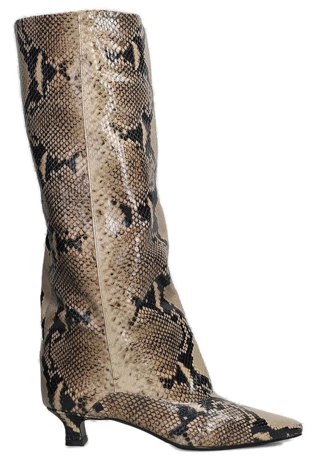 Knee-high boots with a pointed toe and a kitten heel. The boots feature a slouchy shaft and a snakeskin print.