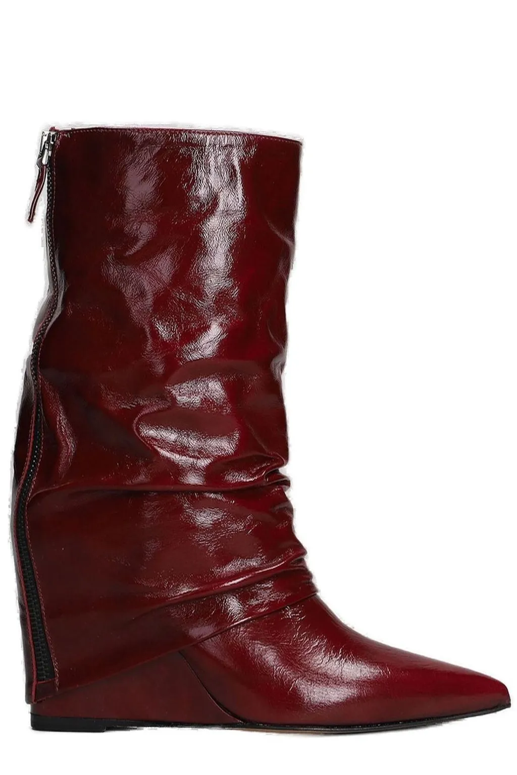 Slouchy mid-calf boots with a pointed toe and a concealed wedge heel. Features a full-length side zipper for closure. The upper has a wrinkled, patent leather-like finish.
