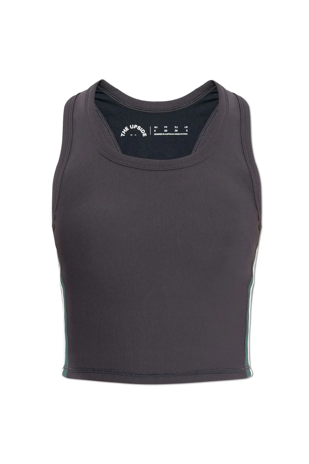 A charcoal grey ribbed crop tank top with a racerback design and contrasting white and green side stripes. It features a rounded neckline and a cropped hem.