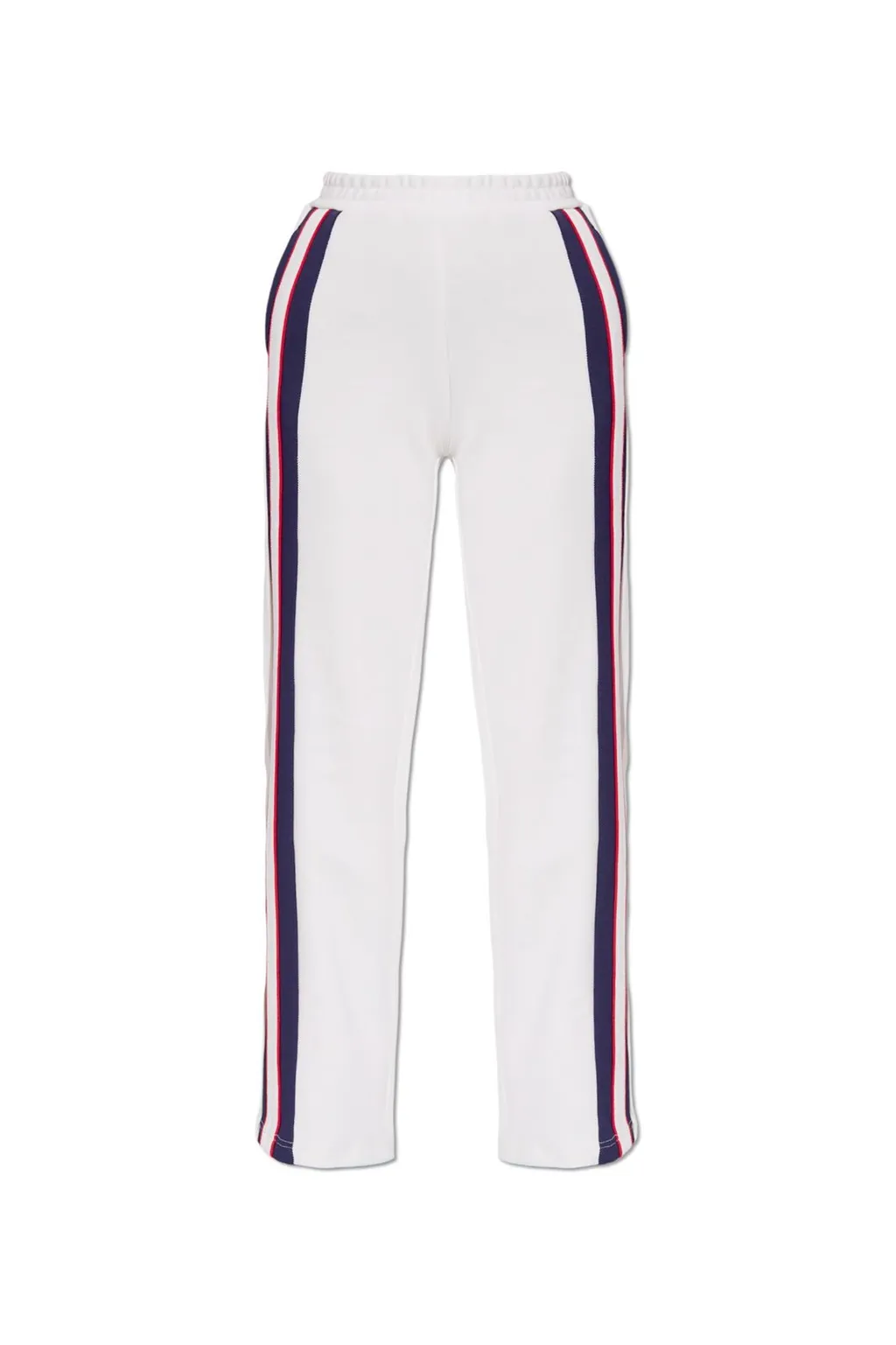 White track pants with a relaxed fit. Features a contrast stripe detail down the side of each leg in navy and red. The pants have a drawstring waist and a side slit at the hem.