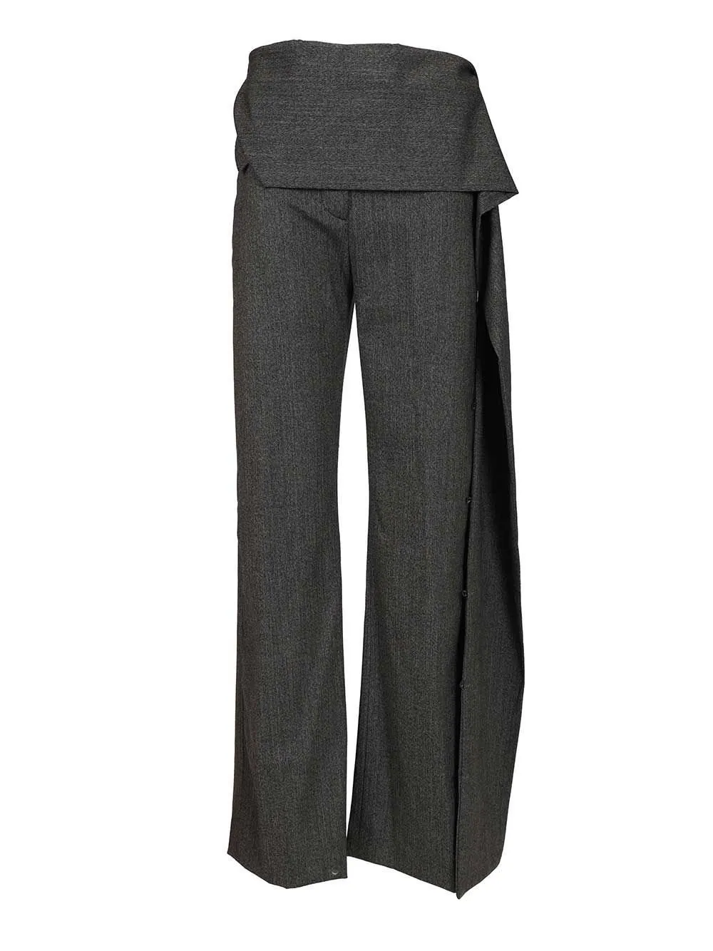 DescriptionHigh-waisted, wide-leg trousers in a grey herringbone fabric. Features a draped overlay that extends from the waistband and down the side of the leg, with button closures along the outer seam. The trousers have a relaxed fit and a flowing silhouette.