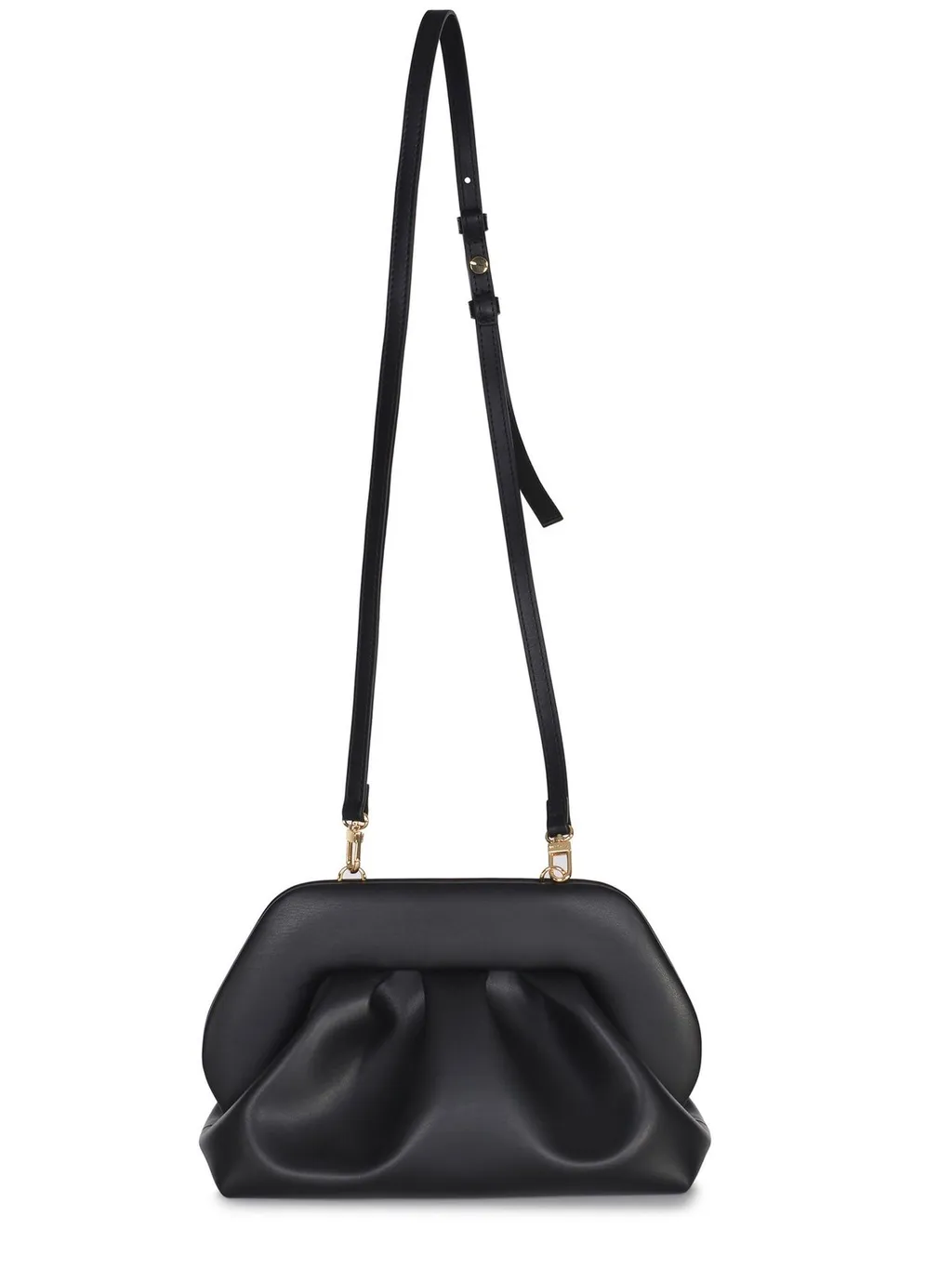 A black clutch bag with a gathered, ruched design. It features a top zipper closure and a small gold-tone loop on one side, possibly for a strap attachment. The bag has a soft, rounded silhouette.