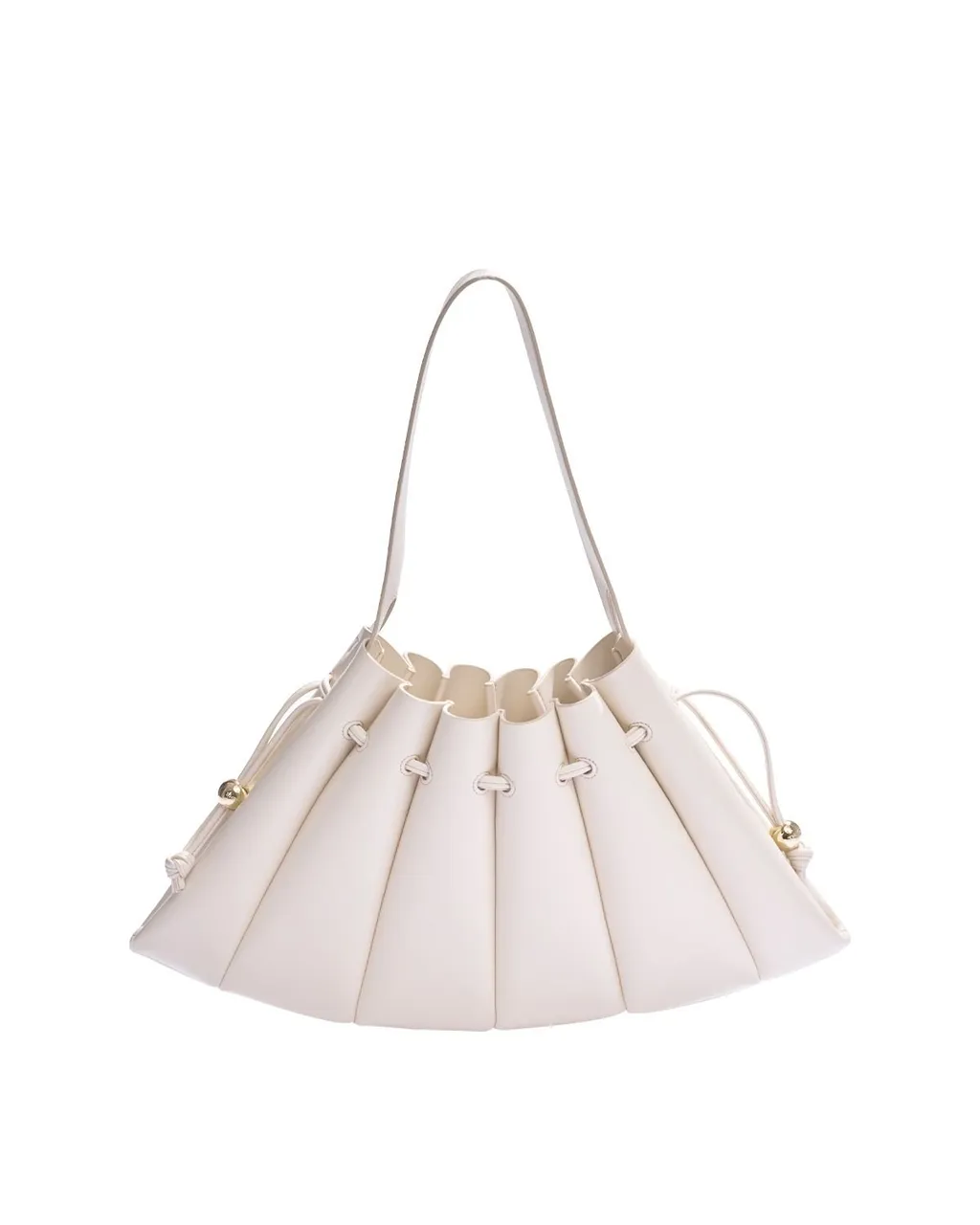 A white shoulder bag with a pleated, fan-like design. It features a single strap and a drawstring closure with gold-tone hardware.