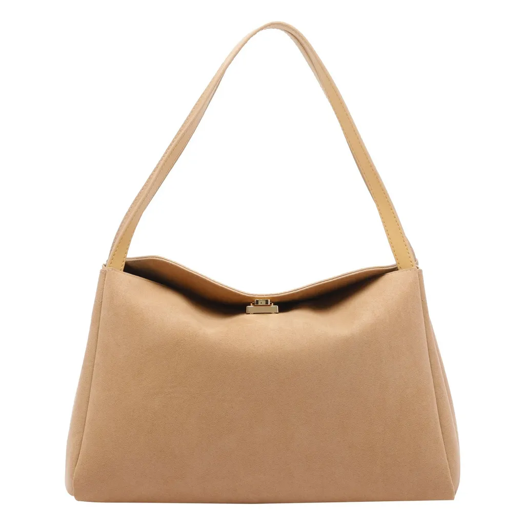 A beige suede shoulder bag with a single strap and a gold-tone clasp closure.