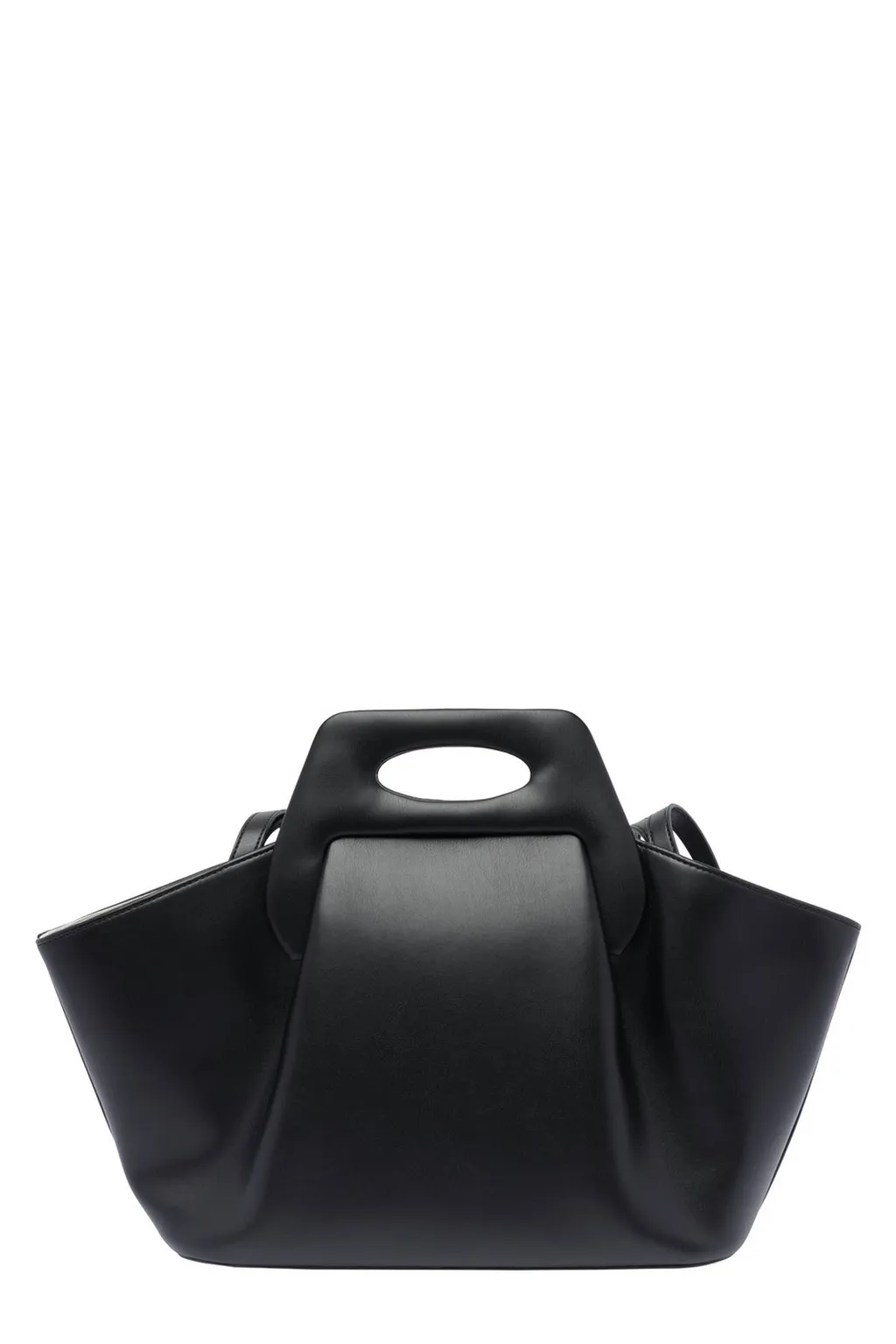 A black tote bag with a unique, sculpted handle. The bag has a soft, unstructured silhouette and a single main compartment.