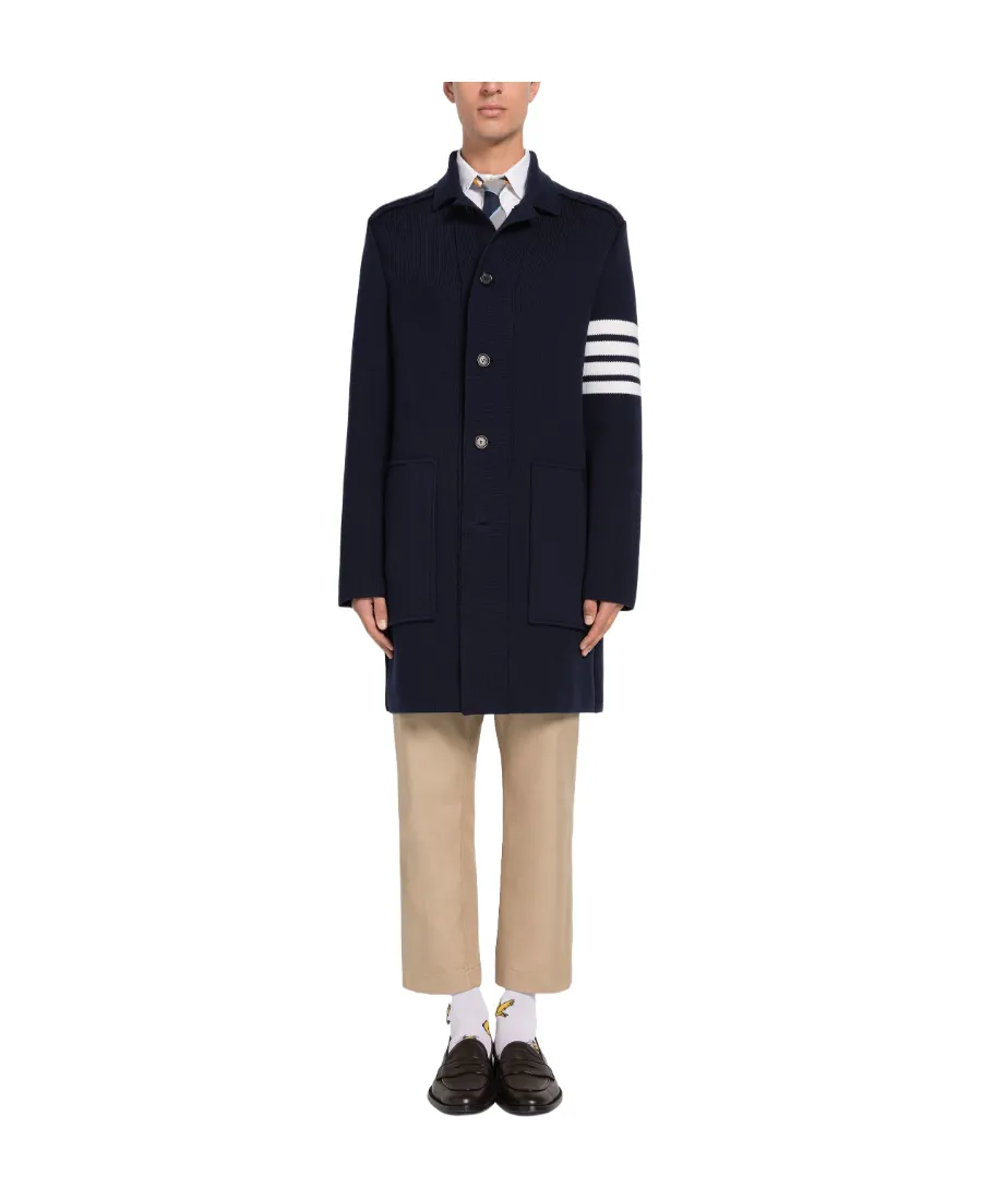 DescriptionNavy blue cotton double-sided cashmere coat with white 4-striped details on the left sleeve. Front button opening and closing, 2 large sticker bag front pocket, single back fork with button, striped satin trim. Iconic striped satin buckle on the back of the neck. Single row buttons.