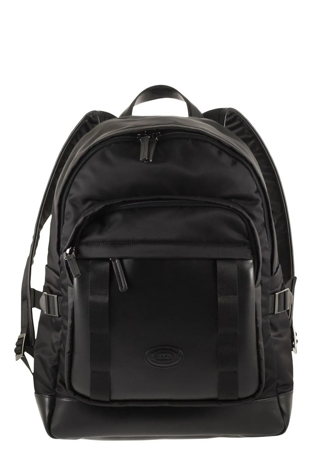 DescriptionA black nylon backpack with leather trim. It features a main zippered compartment, a front zippered pocket, and adjustable shoulder straps. The tod's logo is embossed on the front leather panel.