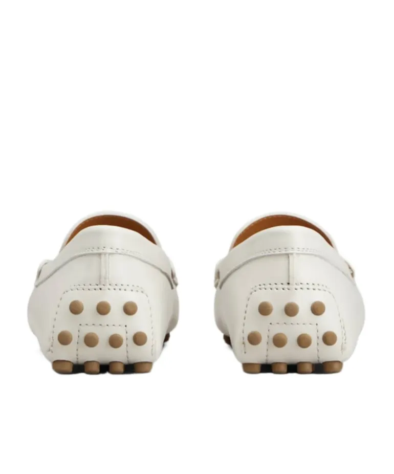 Driving shoes decorated with metal horizontal strips and exposed handmade stitching, featuring a leather insole and rubber beans dotted on the heel.