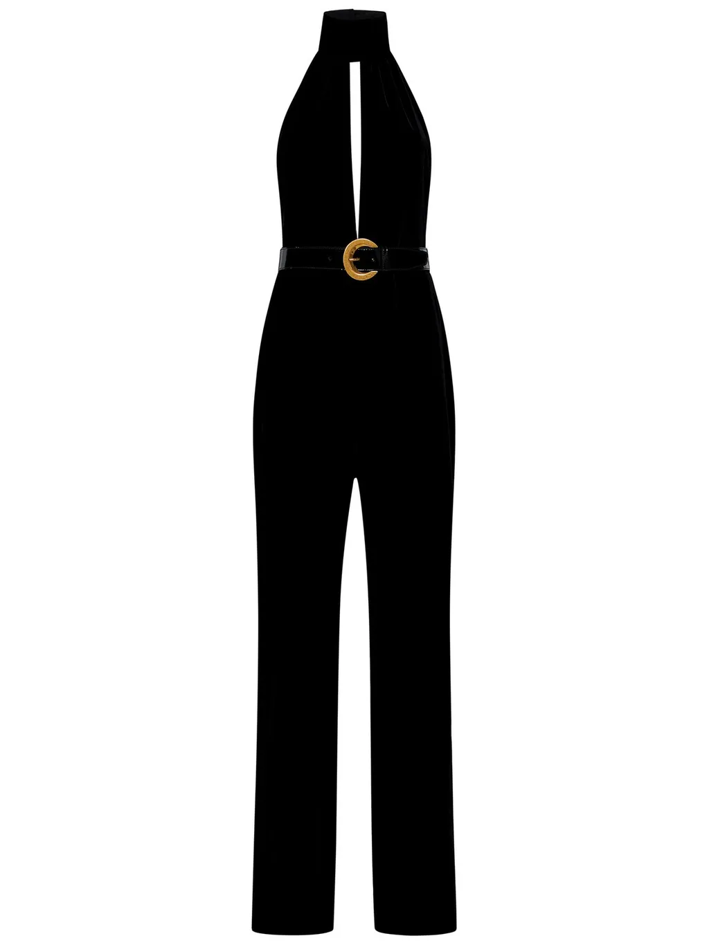 DescriptionA black crepe jumpsuit with a halter neckline, plunging v-neck, and a wide-leg silhouette. It features a tonal patent leather belt with a gold-tone buckle closure at the waist. The jumpsuit has a concealed zip closure at the back.