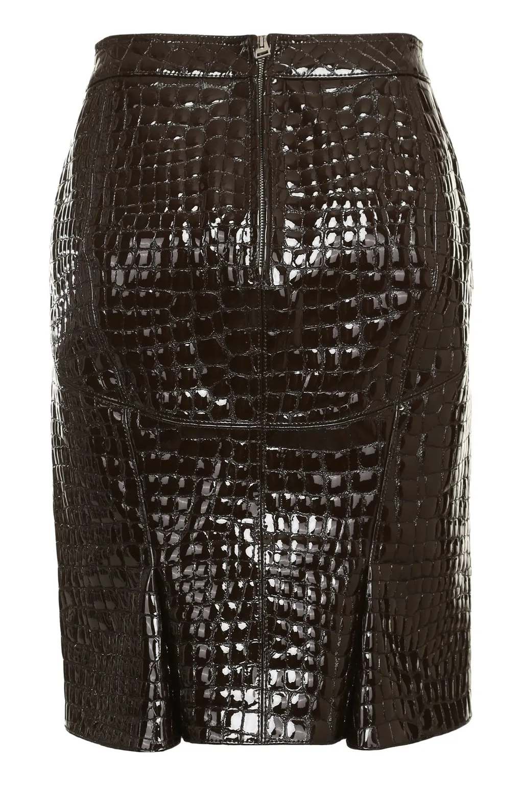 A black, high-waisted pencil skirt with a crocodile-embossed texture. It features a concealed zipper closure at the back and a tailored fit that falls to the knee. The skirt has visible stitching details and paneling.