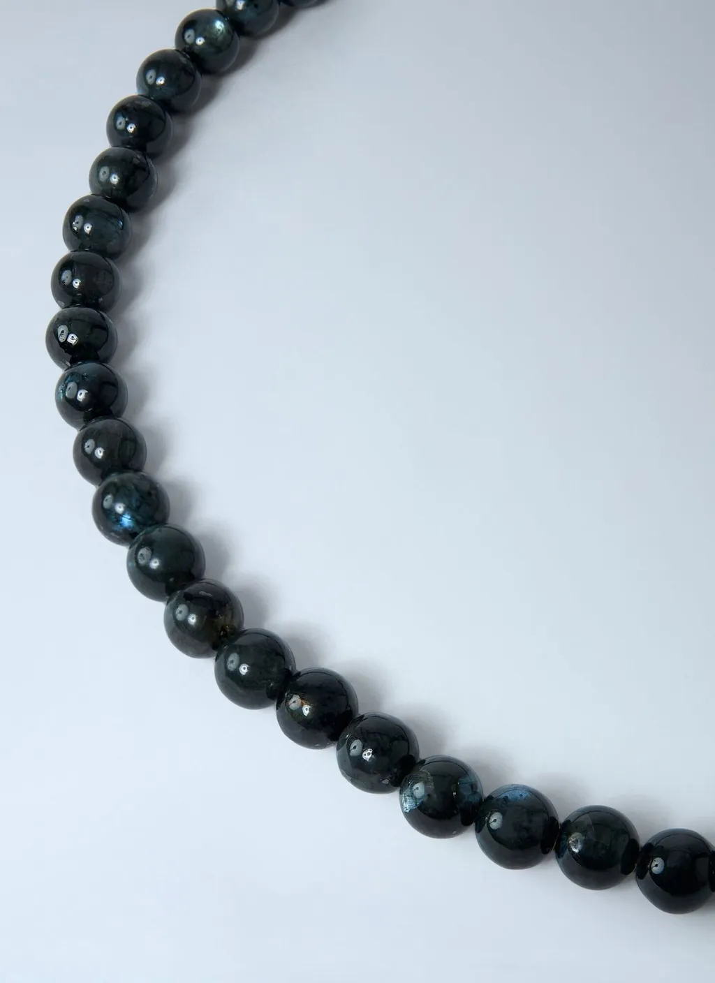 A necklace made of black beads with subtle iridescent blue and green flecks. It features a silver-toned clasp closure.
