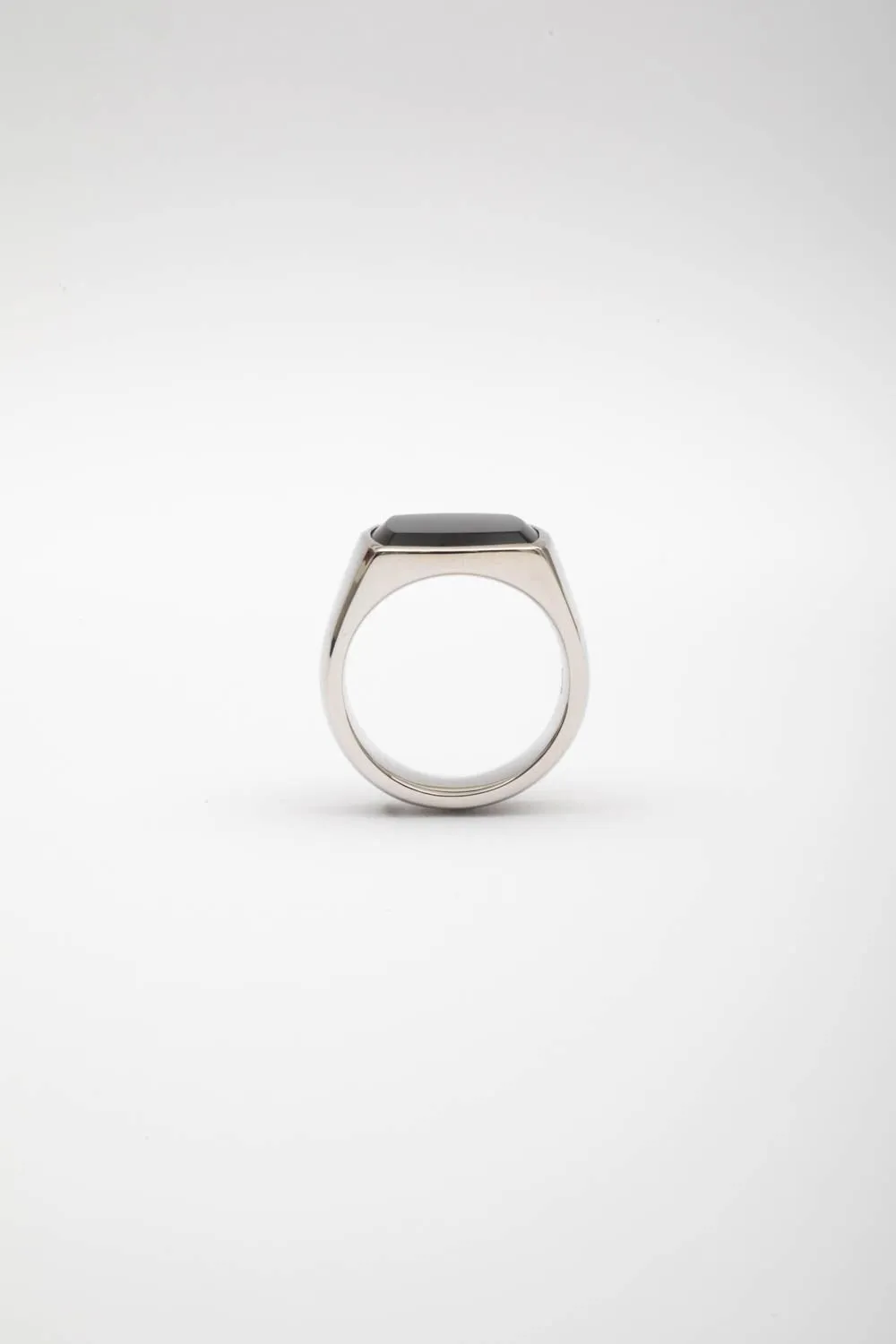 A polished silver signet ring featuring a rectangular black stone inlay.