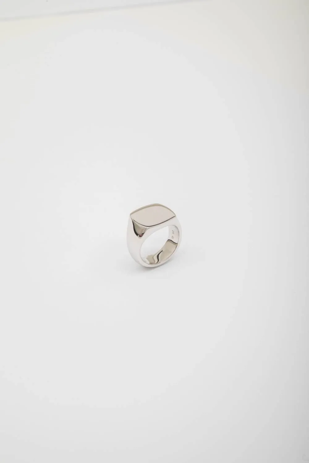 A polished silver signet ring with a rectangular face and a smooth, rounded band.