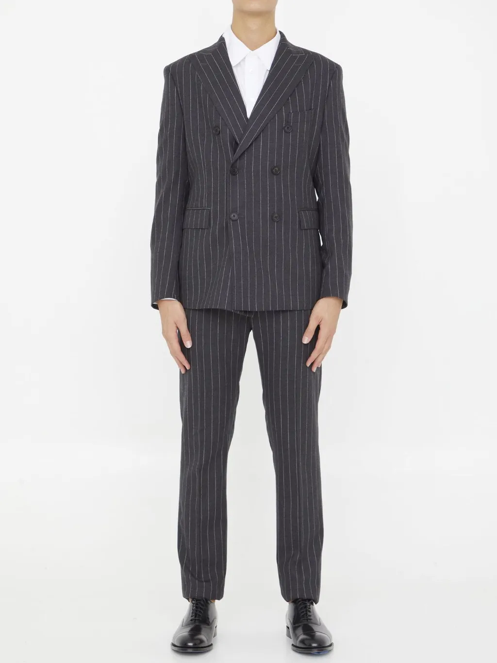 A classic double-breasted suit featuring a subtle pinstripe pattern. The jacket has a notched lapel, two front pockets, and a double-button closure. The trousers are tailored with a straight leg.
