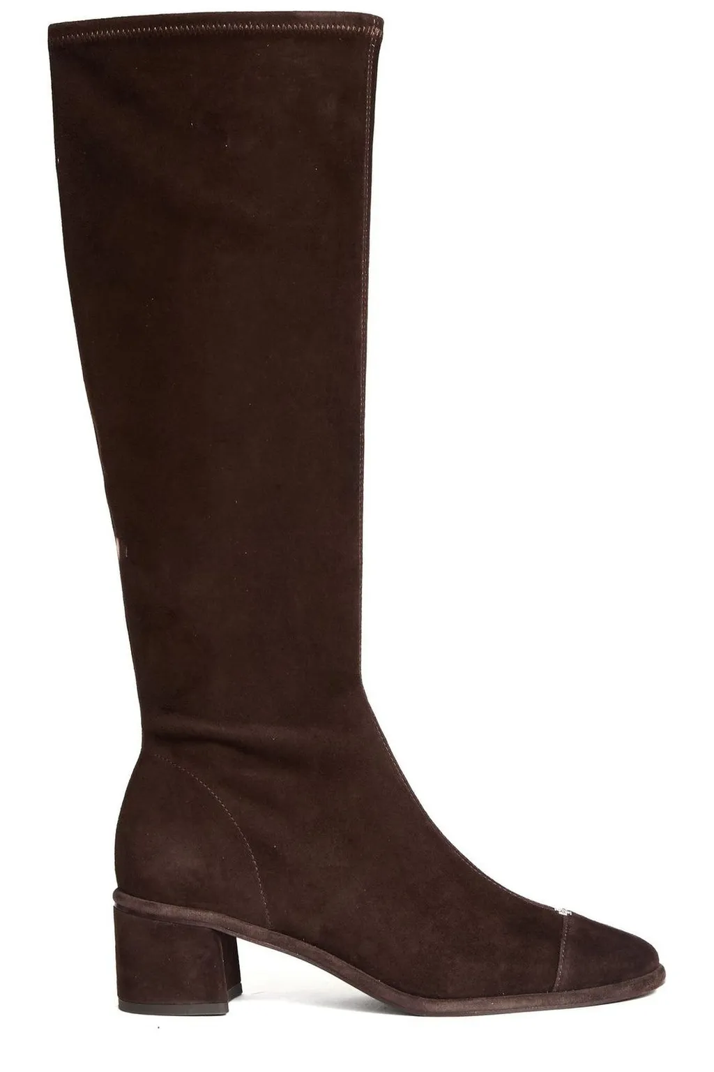 A pair of brown suede knee-high boots with a square toe and a block heel. The boots feature a decorative metal accent on the toe.
