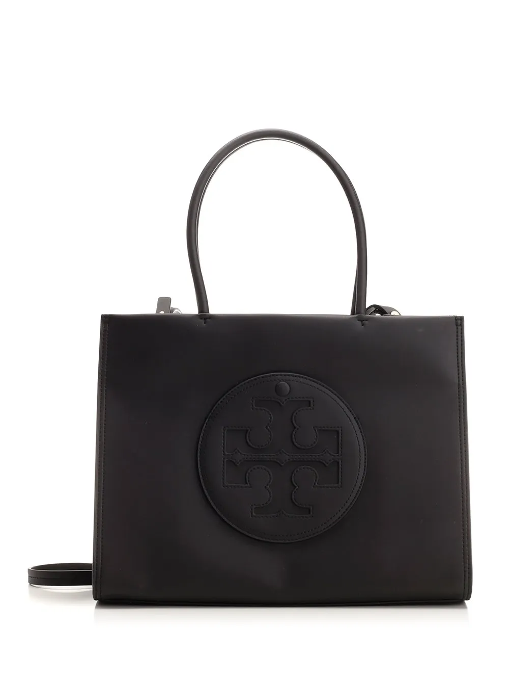 A structured black tote bag with a top handle and an adjustable shoulder strap. The front of the bag features a prominent circular embossed logo.