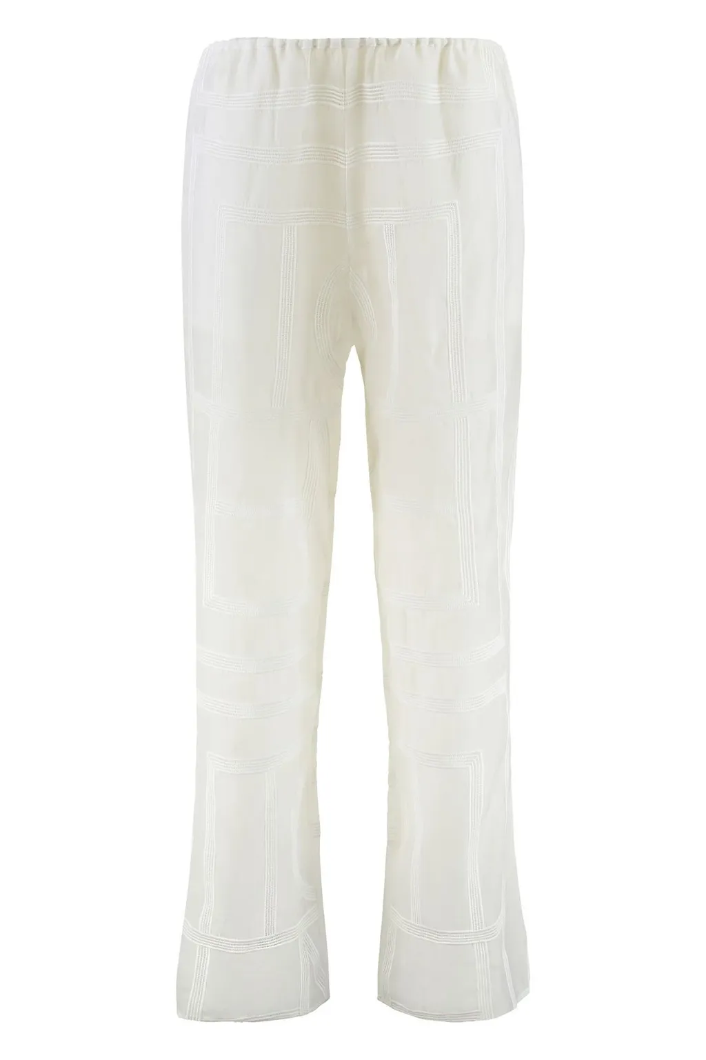 These are wide-leg trousers with a high waist and an elastic waistband. The fabric has a subtle geometric pattern created by tonal stitching. The hem is slightly flared.