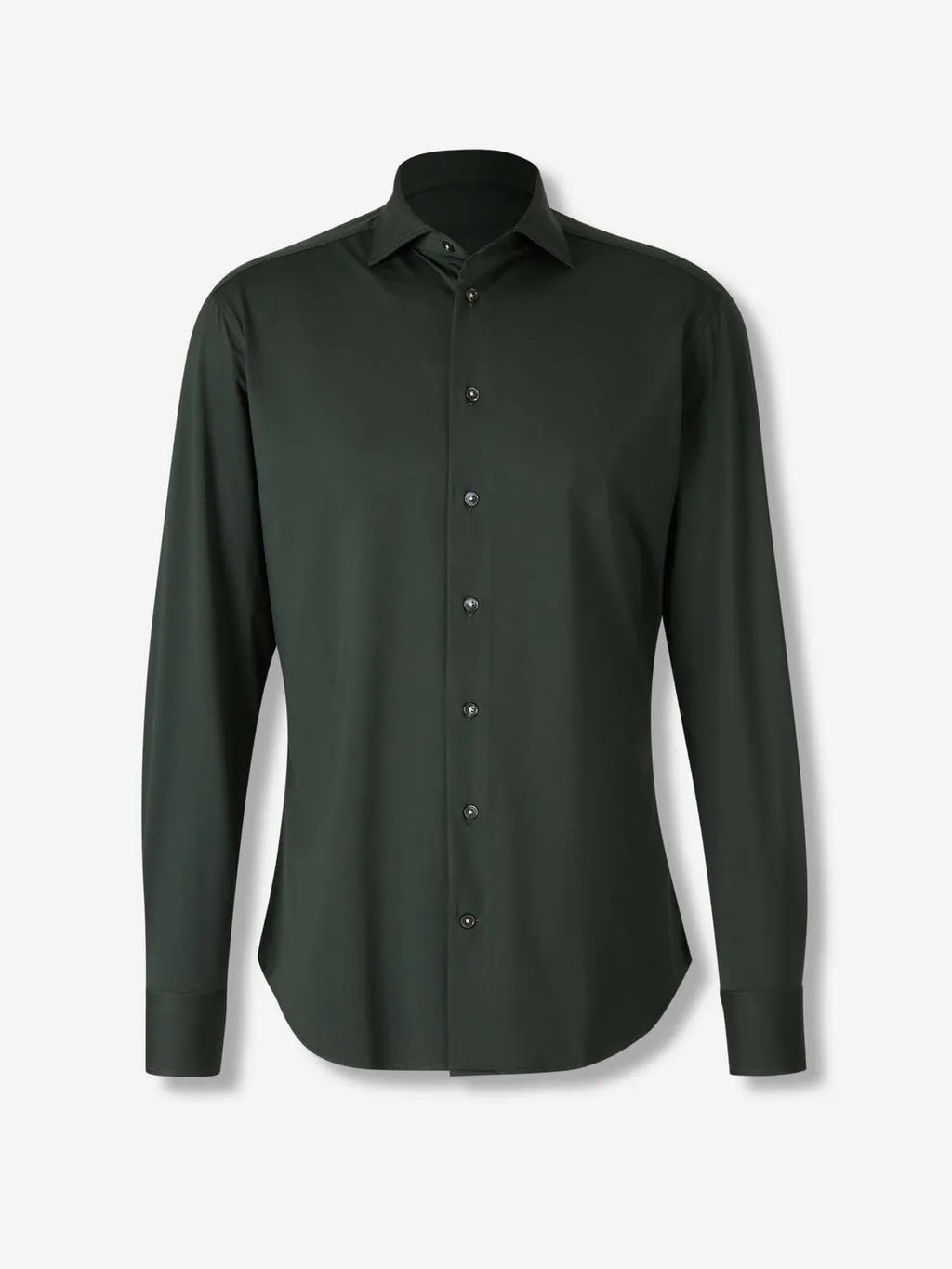 A classic button-down shirt with a pointed collar, long sleeves, and a button-up front. The shirt has a tailored fit and a curved hemline.