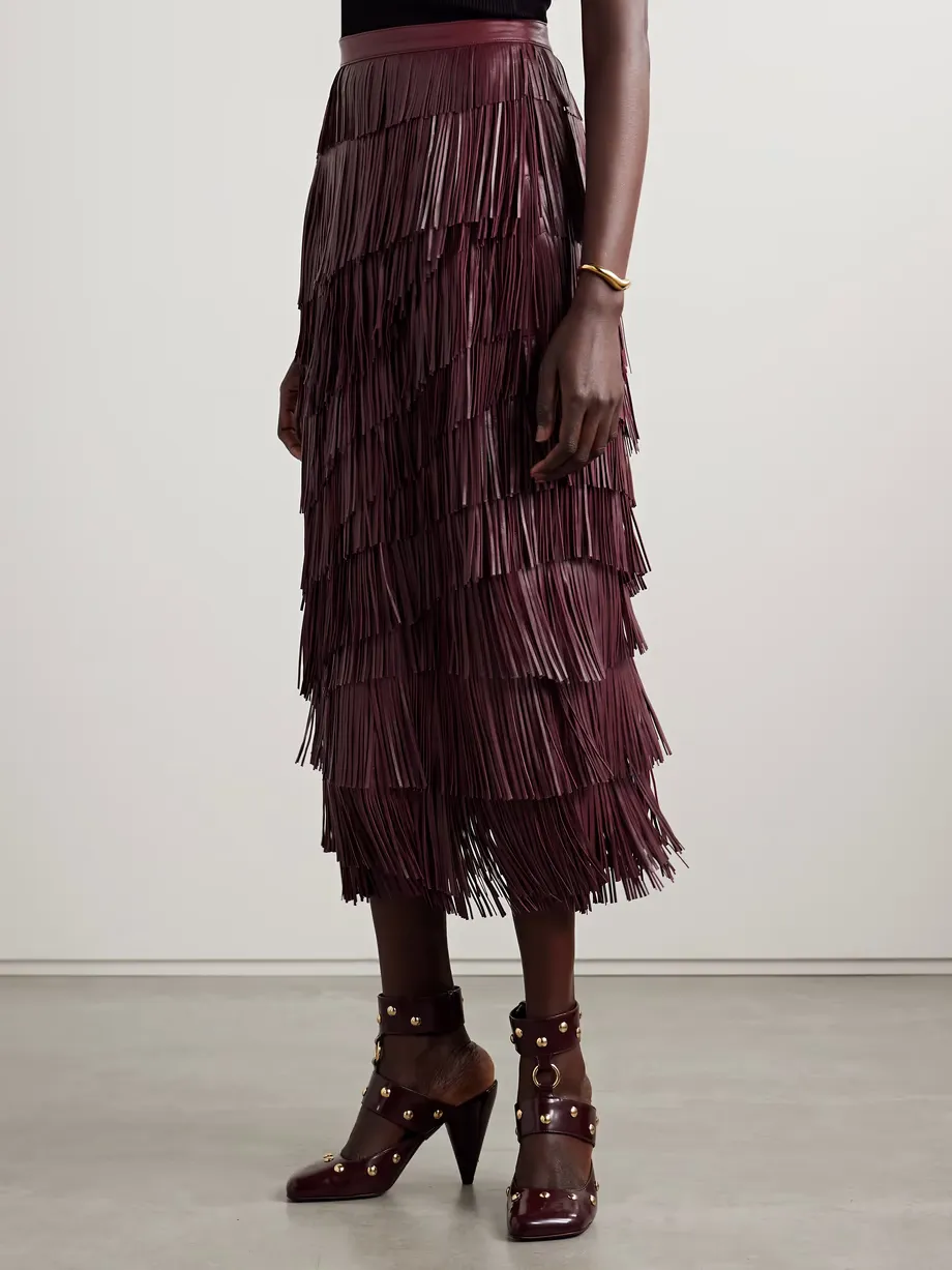 Lambskin mid-length full skirt with cascading asymmetrical leather tassels. Features a semi-open zipper on the back.