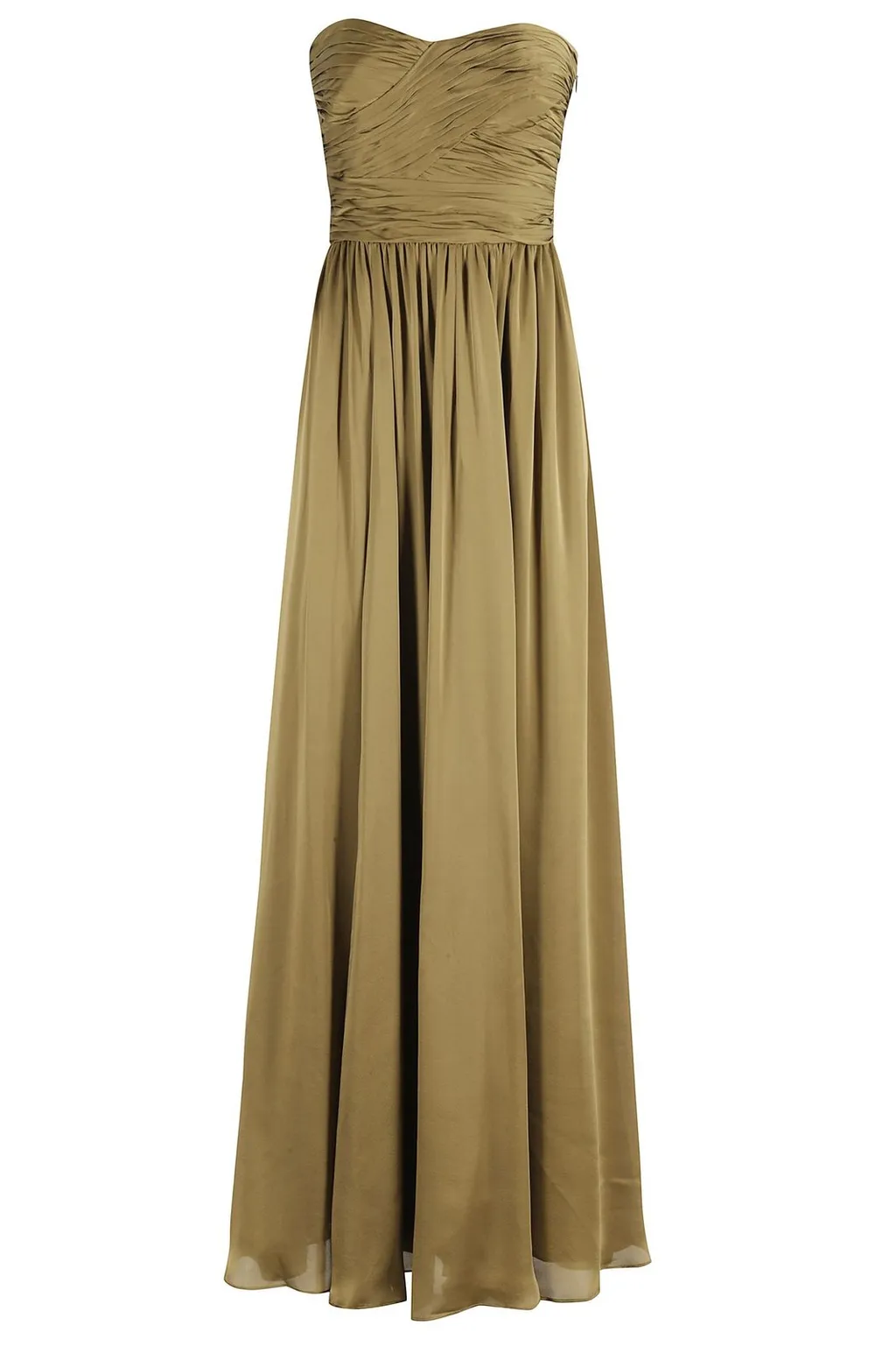 A floor-length, strapless gown with a ruched bodice and a flowing a-line skirt.