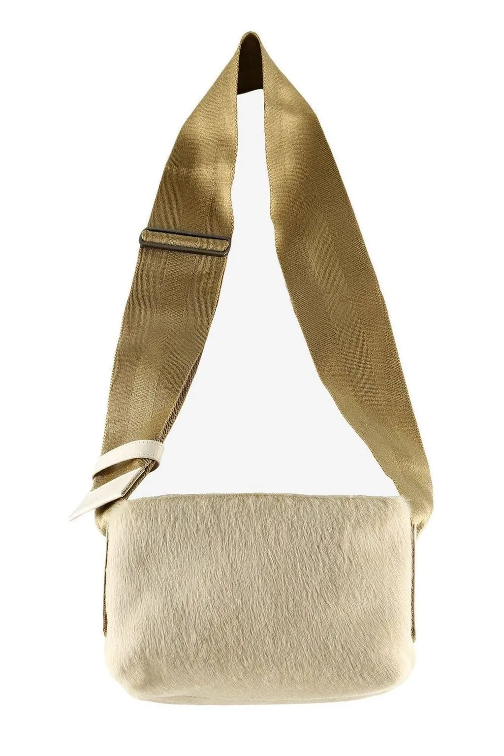 A beige crossbody bag made of fur with a beige adjustable strap. The bag has a rectangular shape and a flap closure.