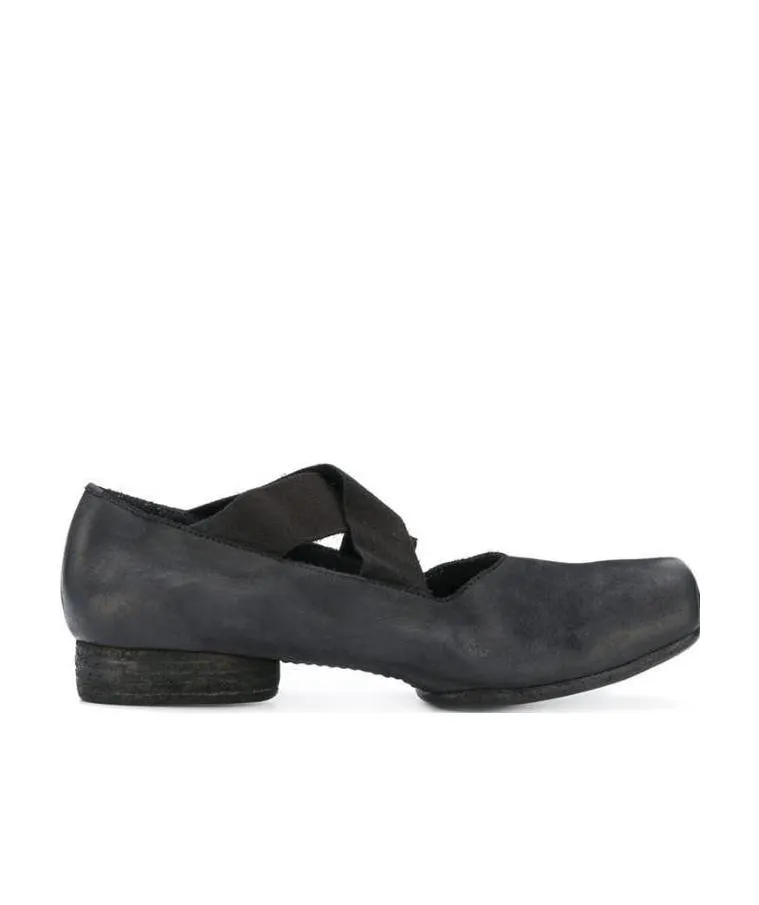 Black ballerina shoes with a square toe, chunky heel, and elastic cross straps. Features contrasting stitching and fold toe tops.