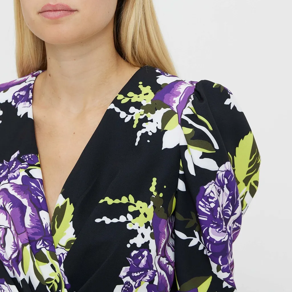 A long-sleeved wrap dress with a v-neckline, puff sleeves, and a black belt at the waist. The dress features a vibrant floral print on a black background.