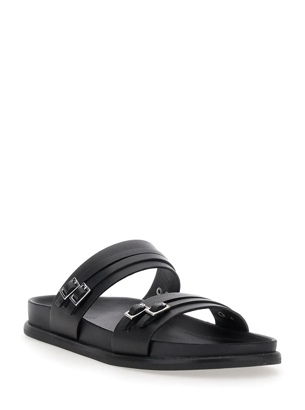 Black leather sandals with two adjustable straps across the vamp, each secured with a silver-tone buckle. The sandals feature a flat sole and a minimalist design.