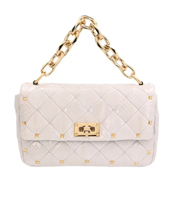 Quilted leather shoulder bag in white with gold-tone stud detailing. Features a turn-lock closure and a detachable shoulder strap.