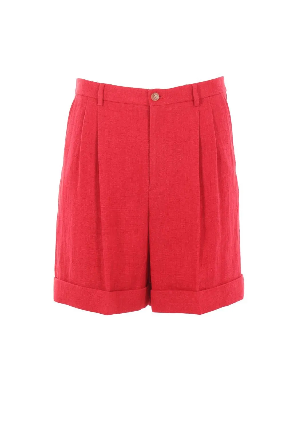 High-waisted shorts with a pleated front and a cuffed hem. Features a button and zip closure, belt loops, and two back pockets with button closures.