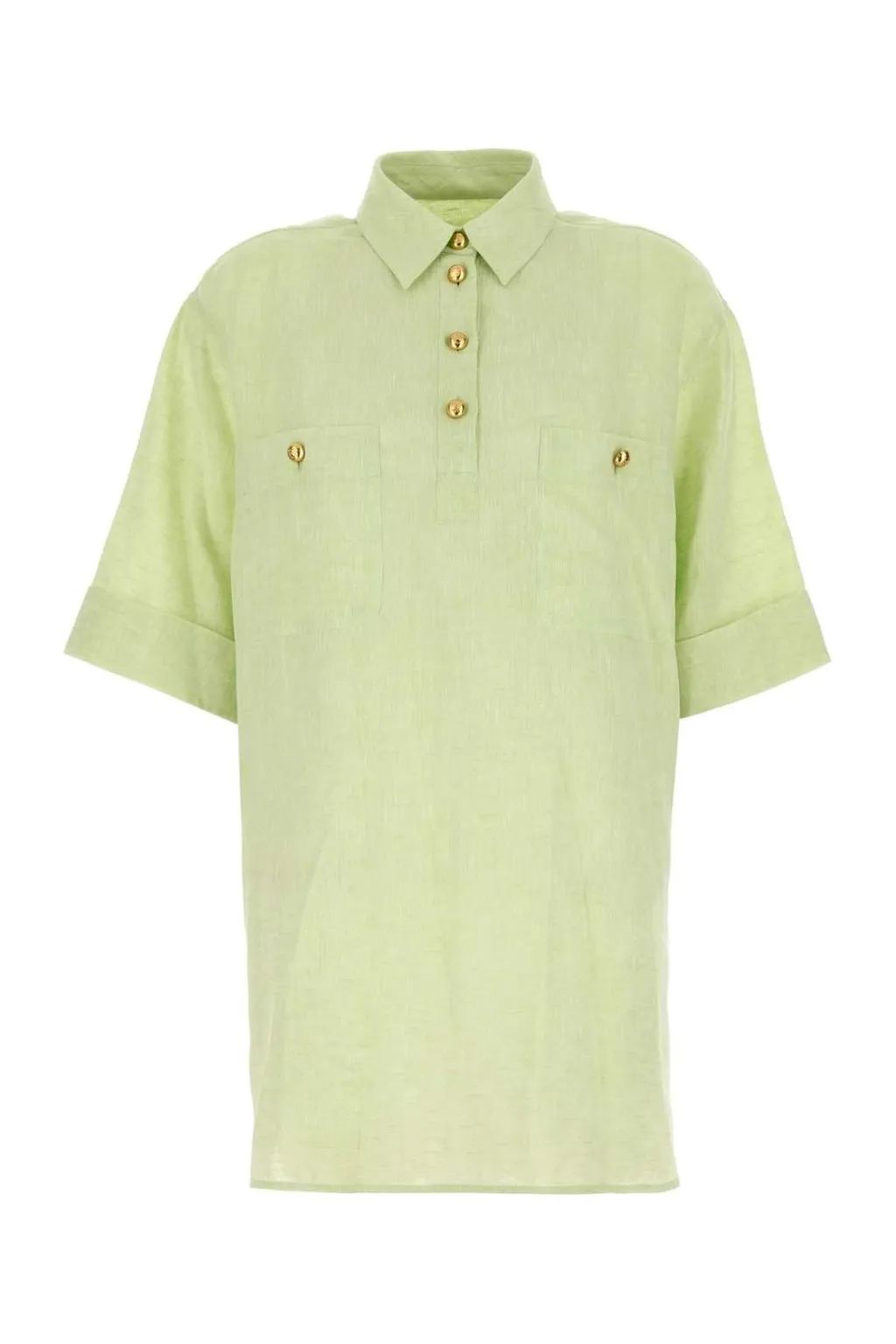 A short-sleeved polo shirt in a light green hue. It features a classic collar, a buttoned placket with gold-tone buttons, and two chest pockets with button closures. The sleeves are cuffed, and the back has a subtle pleat detail.